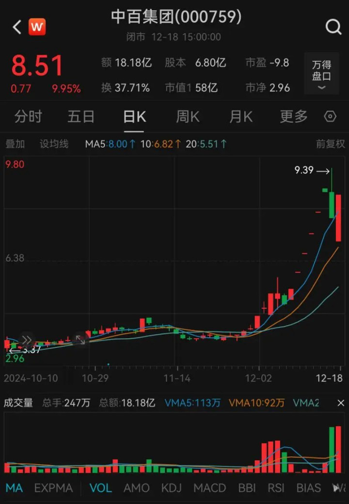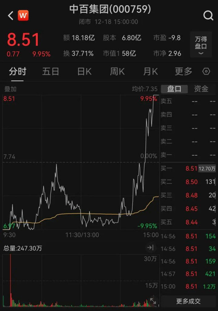 12月以来,中百集团照旧屡次出现涨停,13个交游日内录得5个涨停,累计涨幅高达105.56%。