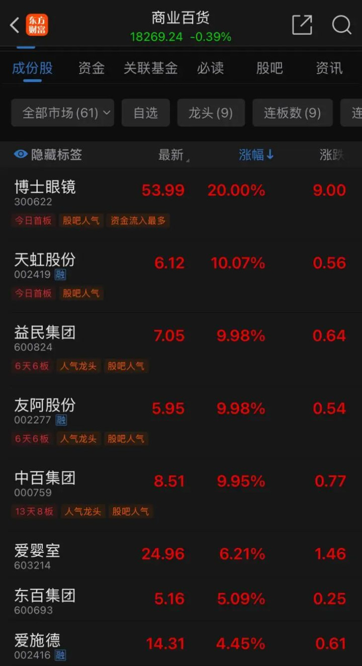 值得驻守的是,中百集团在内的生意百货板块近期出现强势高潮行情。适度12月18日收盘,天虹股份涨停,益民集团、友阿股份更是斩获6连板。